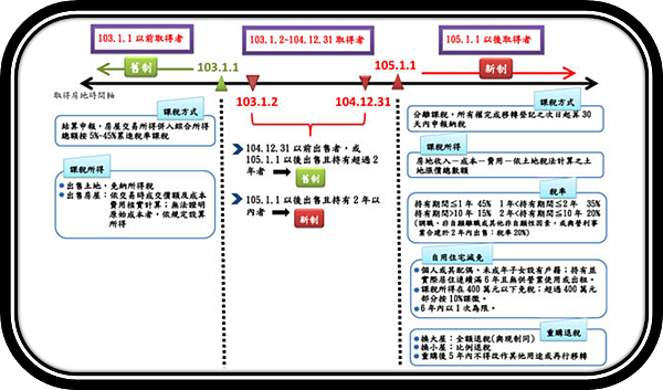 房屋、土地符合下列情形之一者: (一)105 年 1 月 1 日以後取得 (二)103 年 1 月 2 日以後取得,且持有期間在 2 年以內 ※105 年 1 月 1 日以後取得以設定地上權方式的房屋使用權, 視同房屋交易課稅 |